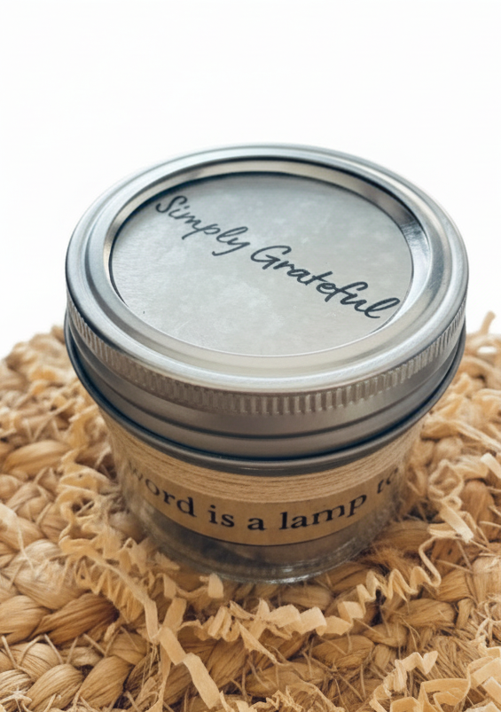 Each glass jar is wrapped in natural twine and finished with a simple Scripture strip with Psalm 119:105— a gentle reminder of the light and guidance God gives.